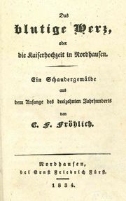| 18:08, 23. Jun. 2021 | Das blutige Herz.jpg (Datei) | 163 KB | Vincent Eisfeld (Diskussion | Beiträge) | {{Information_Alt_Datei_Hochladen |Beschreibung = Das blutige Herz, oder die Kaiserhochzeit in Nordhausen |Quelle = Scan |Urheber = Carl Schöpfer (alias C. F. Fröhlich) |Datum = 1834 |Genehmigung = |Andere Versionen = |Anmerkungen = }} | 1 | |