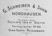 | 17:06, 10. Jan. 2022 | Schreiber und Sohn Nordhausen.jpg (Datei) | 9 KB | Vincent Eisfeld (Diskussion | Beiträge) | {{Information_Alt_Datei_Hochladen |Beschreibung = Briefkopf Schreiebr & Sohn, Nordhausen |Quelle = Scan |Urheber = Schreiebr & Sohn |Datum = ca. 1900 |Genehmigung = |Andere Versionen = |Anmerkungen = }} | 1 | |