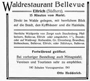 | 18:47, 26. Aug. 2024 | Anzeige Waldrestaurant Bellevue.jpg (Datei) | 287 KB | Vincent Eisfeld (Diskussion | Beiträge) | {{Information_Alt_Datei_Hochladen |Beschreibung = Anzeige Waldrestaurant Bellevue |Quelle = Scan |Urheber = Otto Hedderich |Datum = um 1920 |Genehmigung = |Andere Versionen = |Anmerkungen = Direkt im Walde gelegen, mit herrlichem Blick auf die Stadt, den Kyffhäuser und die Hainleite. Herrliche Waldpartie von Zorge nach Staufenberg, Pfaffenborn, Bellevue, Ellrich oder umgekehrt, 1 */2 Stunde; oder auf Waldweg: Rothesütte, Gr. Ehrenberg, Brandhay, Rot… | 1 | |