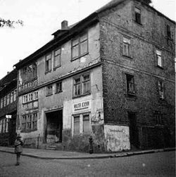 Der einstige Gebäudekomplex wurde Ende der 1970er Jahre abgerissen. Für das Jahr 1876 sind umfangreiche Reperaturen am Hintergebäude bezeugt, der Stall wurde zum Teil auch als Waschhaus genutzt. Anstelle der Fachwerkkonstruktion wurde 1886 die Etage in Massivbauweise errichtet. 1907 folgen weitere erhebliche um- und ausbauten; das Dachgeschoss wird zu Wohnzwecken ausgebaut wobei auch der Gebäudegiebel in Mauerwerk neu aufgeführt wurde.