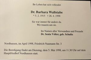 Barbara Wallstabe (geb. 5. Februar 1915; gest. 26. April 1998 in Nordhausen) war Studienrätin.