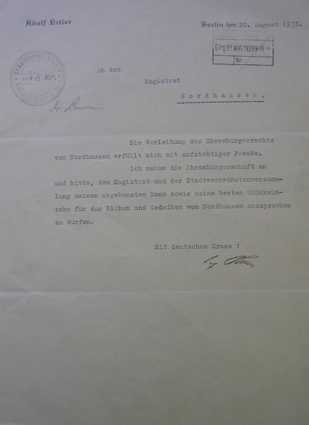 Dankschreiben von Adolf Hitler an den Magistrat Nordhausen, Ehrenbürgerschaft