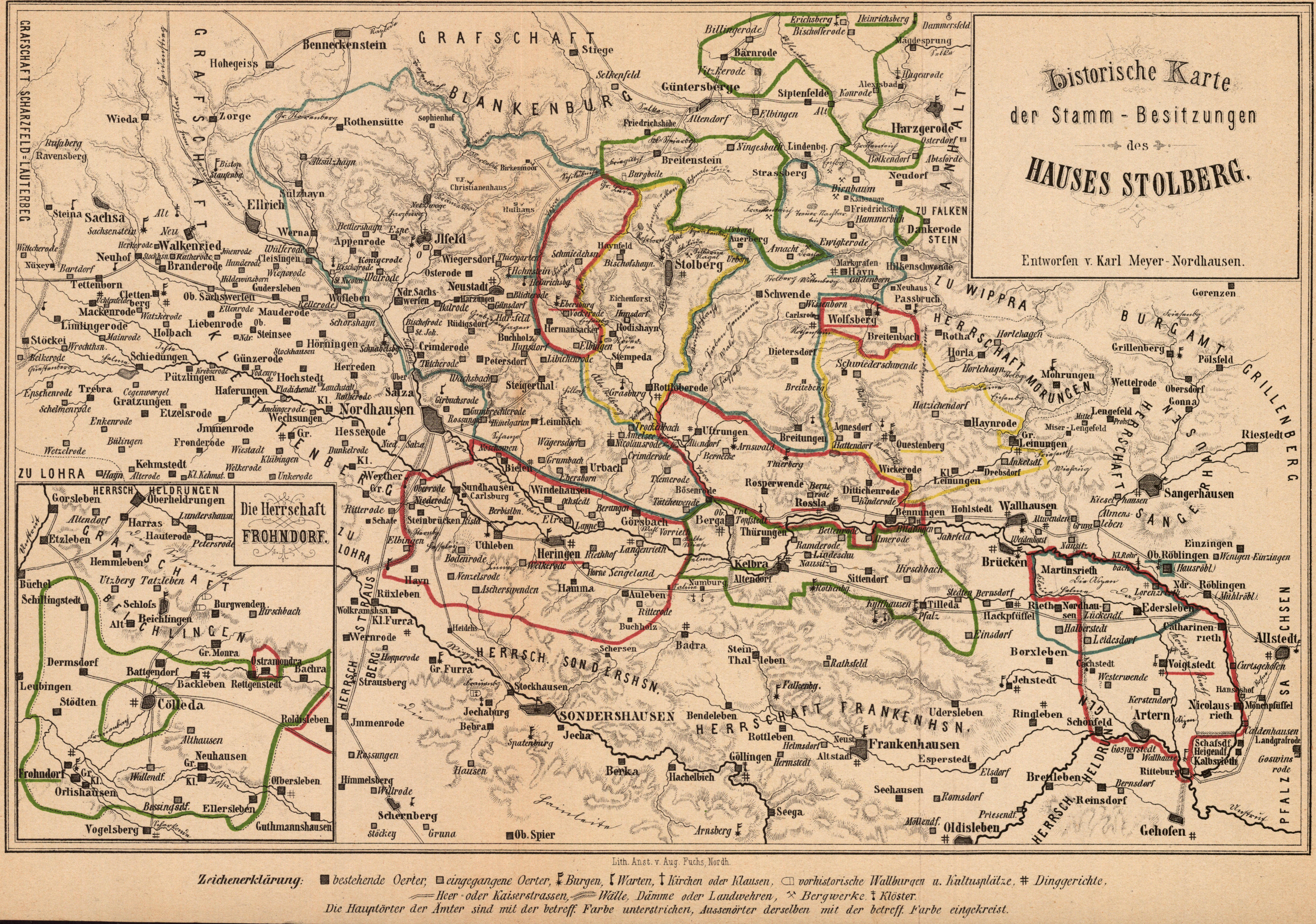 Historische Karte der Stamm-Besitzungen des Hauses Stolberg, entworfen von Karl Meyer, mit dem weiteren Titel "Die Herrschaft Frohndorf". |
