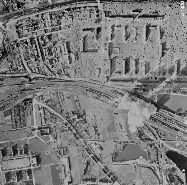 US-Luftbild nach den Luftangriffen auf Nordhausen, rechts oben die Boelcke-Kaserne, links unten der Fliegerhorst