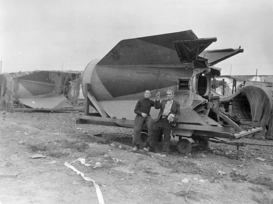 Zwei Häftlinge vor einer halbfertigmontierten V2 (Industriegelände des Konzentrationslagers Mittelbau-Dora)