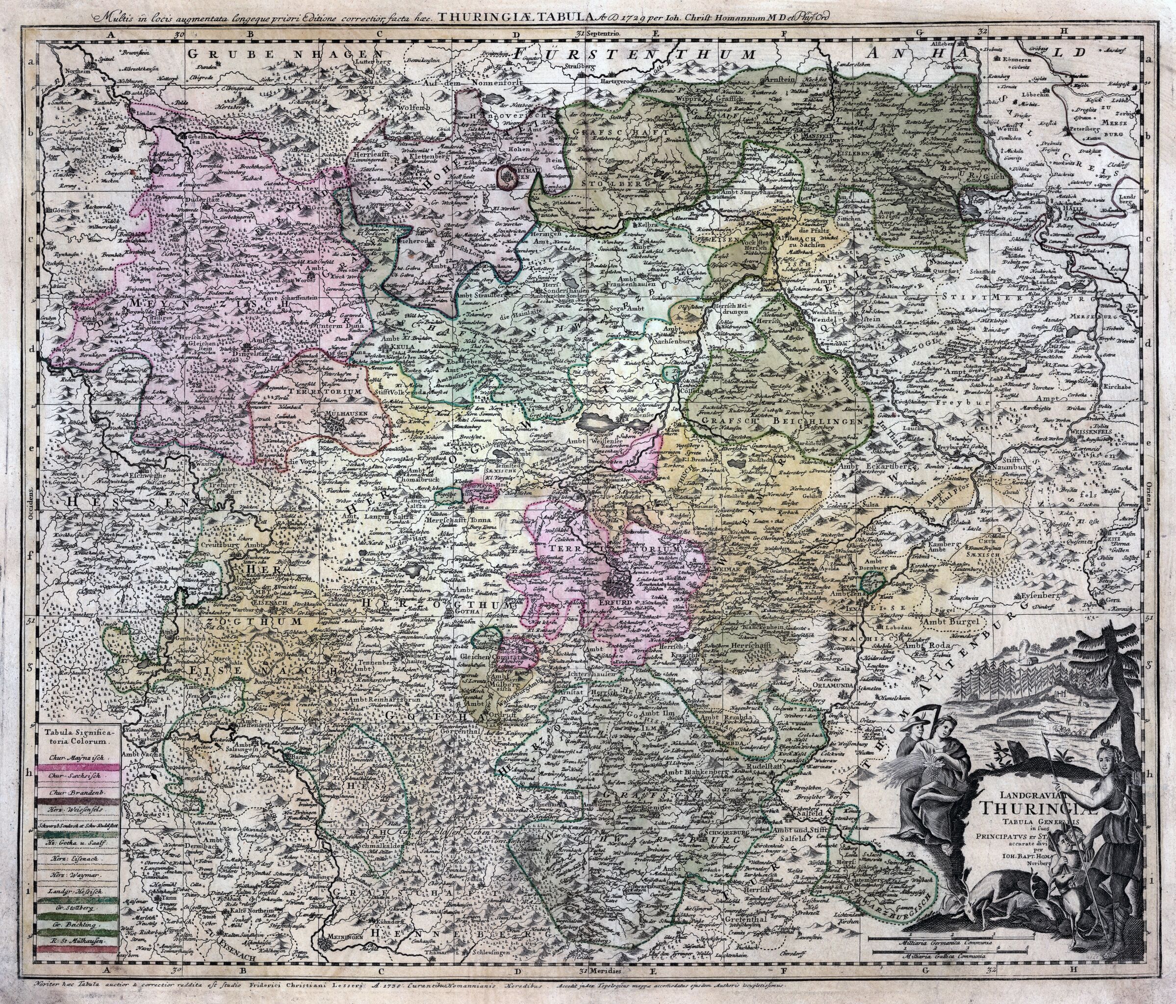 Landgraviatus Thuringiae Tabula Generalis: eine historische Karte, die das Gebiet Thüringens in verschiedene Fürstentümer und Stände unterteilt. Die Karte wurde von Johann Baptist Homann und Johann Christoph Homann erstellt und 1738 veröffentlicht. Sie zeigt detailliert das Territorium im Maßstab 1:340.000 und enthält dekorative Kupferstiche. |