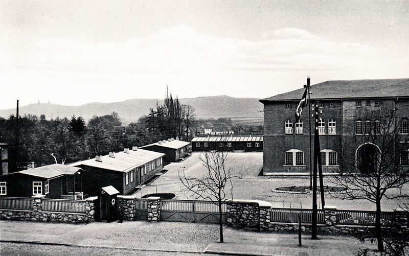 Reichsarbeitsdienst Abteilung 7/145 "Kaiser Friedrich II" Roßla - Harz. Das Gelände wurde später teilweise als KZ-Außenlager genutzt wurde. Die Baracken links im Bild wurden 1936 auf dem Betriebsgelände einer Zuckerfabrik errichtet und dienten später zur Unterbringung der KZ-Häftlinge. |