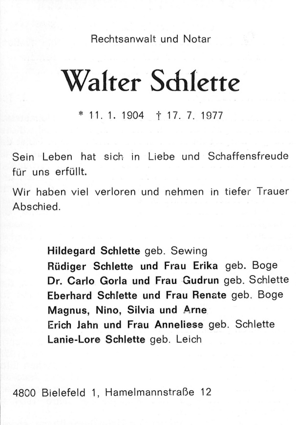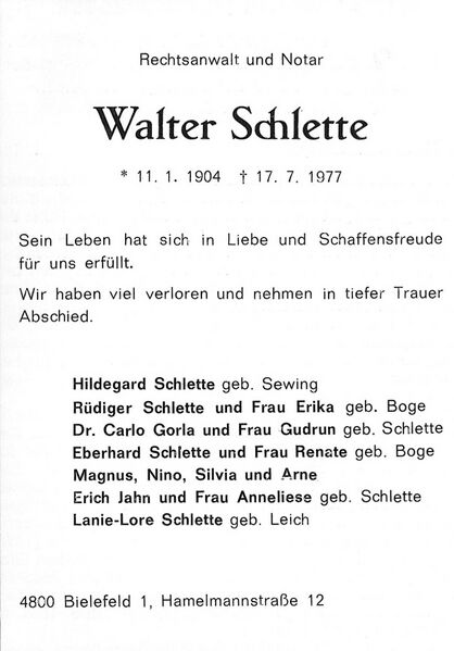 Sein Leben hat sich in Liebe und Schaffensfreude für uns erfüllt. Wir haben viel verloren und nehmen in tiefer Trauer Abschied. Hildegard Schlette geb. Sewing Rüdiger Schlette und Frau Erika geb. Boge Dr. Carlo Gorla und Frau Gudrun geb. Schlette Eberhard Schlette und Frau Renate geb. Boge Magnus, Nino, Silvia und Arne Erich Jahn und Frau Anneliese geb. Schlette Lanie-Lore Schlette geb. Leich