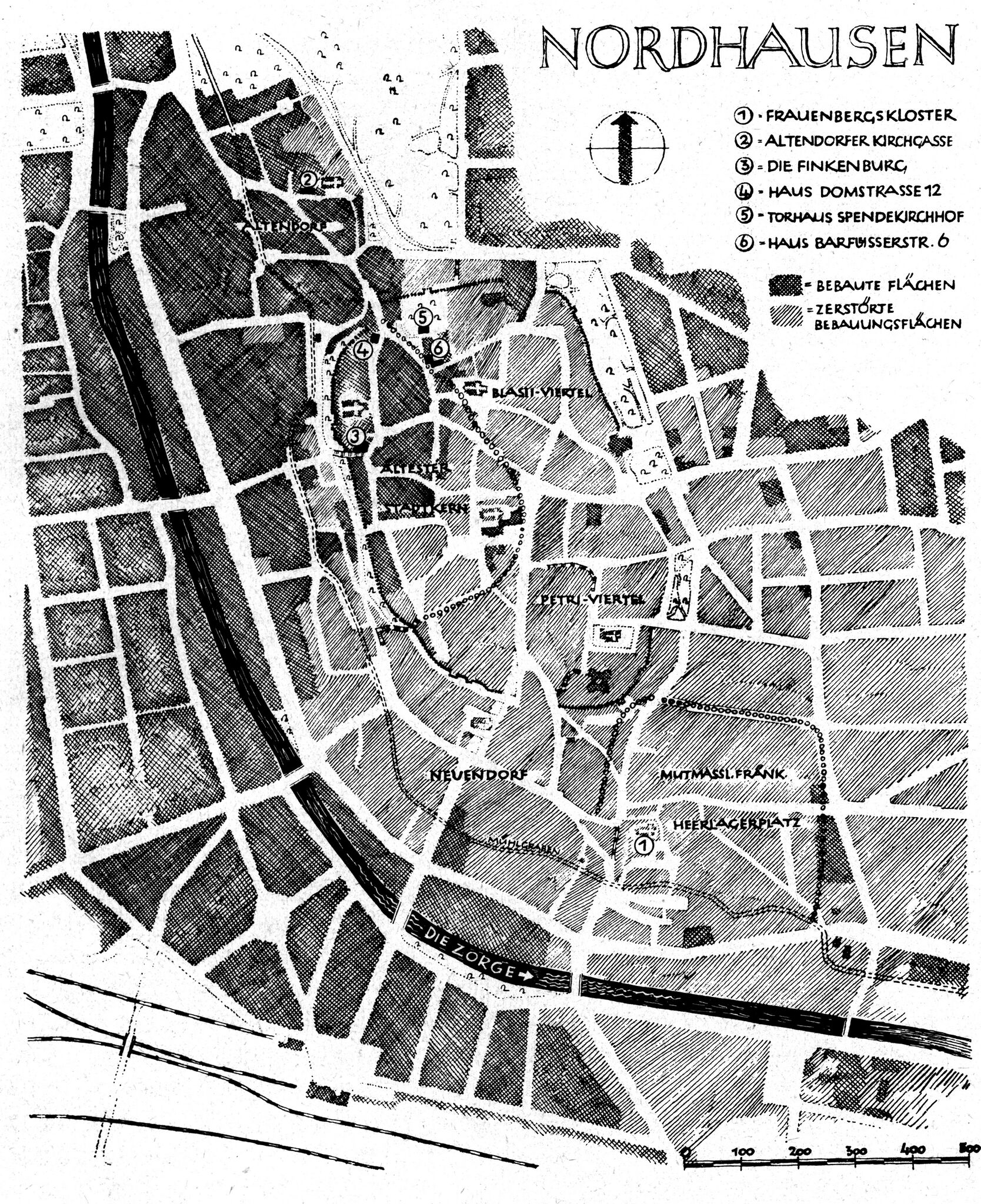 Stadtplan von Nordhausen mit zerstörten Bebauungsflächen