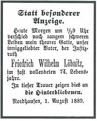 | Nachruf. Am 1. August, 1/2 9 Uhr Vormittags verschied der Stadtverordneten-Vorsteher, Königliche Justizrath Friedrich Wilhelm Löbnitz nach längerem Leiden im 74. Lebensjahre. Der Entschlafene gehörte dem Stadtverordneten-Kollegium, in welchem er das Amt des Vorsitzenden seit 12 Jahren bekleidet hat, seit dem 2. Januar 1871 ununterbrochen an. Getragen von dem Vertrauen seiner Kollegen und der gesammten Bürgerschaft, hat er bis zuletzt unermüdlich und mit seltener Pflichttreue seines schwierigen und arbeitsvollen Amtes gewaltet und sich durch seine unserem Gemeinwesen gewidmete opferfreudige und uneigennützige Thätigkeit, durch die schlichte Würde seines persönlichen Auftretens in den Herzen Aller, die ihm amtlich oder persönlich näher zu treten Gelegenheit gehabt haben, ein bleibendes, ehrenvolles Andenken gesichert. Trauernd stehen seine Mitarbeiter mit der gesammten Bürgerschaft an dem Sarge eines der besten Bürger dieser Stadt und legen auf das Grab des Entschlafenen voll Liebe und Dankbarkeit die Bürgerkrone als Lohn der Ehrenhaftigkeit, Mannhaftigkeit und Treue. Friede seiner Asche! Nordhausen, den 2. August 1889. |