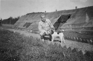 KZ-Außenlager Harzungen mit Tarnnetzen bespannten Baracken. Im Bild Ludwig Schiller, politischer Häftling (Haft-Nr. 28936) und Funktionshäftling in Harzungen. Schiller war Kapo der Häftlingsschreibstube und hatte das Recht, Haustiere zu halten.