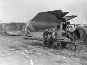 Zwei Häftlinge vor einer halbfertigmontierten V2 (Industriegelände des Konzentrationslagers Mittelbau-Dora)
