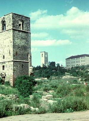 Der verbleibende Kirchturm wurde 1959 gesprengt. Im Hintergrund der Petriturm (1954)
