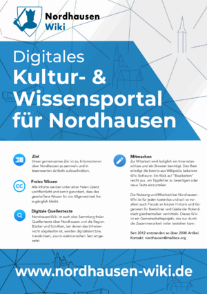 Bei diesem Wiki handelt es sich nicht um eine offizielle Netzseite der Stadt Nordhausen. Diese ist unter http://www.nordhausen.de/ zu erreichen.