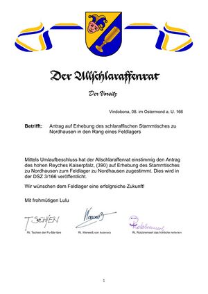Seit dem 18.03.2025 ist der Verein durch den internationalen Allschlaraffenrat in den Stand eines Feldlagers erhoben worden, was die Mitglieder gebührend mit einer Sippung am 10. Mai 2025 in der Traditionsbrennerei feiern werden.