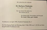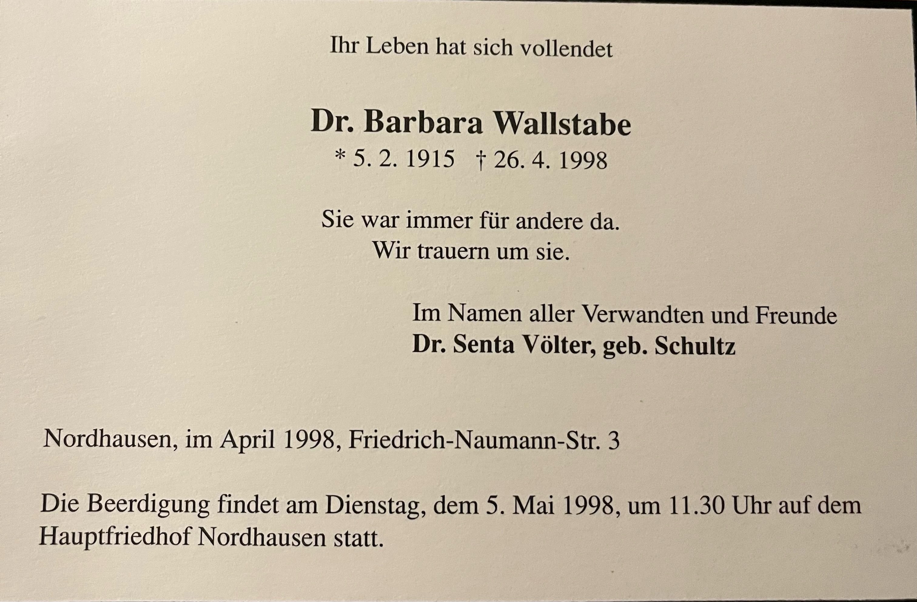 11:43, 30. Nov. 2024 Barbara Wallstabe.jpeg (Datei) 1,55 MB {{Information_Alt_Datei_Hochladen |Beschreibung = Traueranzeige für Barbara Wallstabe: Ihr Leben hat sich vollendet '''Dr. Barbara Wallstabe''' * 5. 2. 1915 † 26. 4. 1998 Sie war immer für andere da. Wir trauern um sie. Im Namen aller Verwandten und Freunde '''Dr. Senta Völter, geb. Schultz''' Nordhausen, im April 1998, Friedrich-Naumann-Str. 3 Die Beerdigung findet am Dienstag, dem 5. Mai 1998, um 11.30 Uhr auf dem Hauptfriedhof Nordhausen statt. |Quelle = unbe… 1