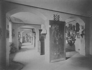 „Die kunst- und kulturgeschichtlichen Gruppen umfassen Erzeugnisse von den ältesten Epochen bis zu der Grenze der Gegenwart, von der jüngeren Steinzeit bis zum Klassizismus. Die kunstgewerbliche Sammlung, deren wesentlichste Teile in den Stilzimmern vereinigt sind, beginnt mit Gegenständen aus der Zeit der hohen Gotik, also vom 14. Jahrhundert bis in den Anfang des 16. und gibt weiter Einblick in die künstlerische Kultur der Renaissance, des Barock und der folgenden Epochen bis zum Ausgange des Biedermeierstiles. Auf Einzelheiten dieser sehr umfangreichen Abteilung einzugehen, ist hier nicht möglich. Aus der Gruppe der kirchlichen Kunst nennen wir als noch nicht erwähnt die überaus kostbaren Bestände eines Fundes, der 1911 in dem Schreiberschen Hause, Töpferstraße 7, gemacht wurde. Die Gegenstände haben ohne Zweifel einer Kirche oder einem Kloster gehört (wahrscheinlich Himmelgarten) und dürften vergraben sein, um sie vor der Raubsucht der Bauern zu retten. Außer einer Anzahl von kleineren Stücken sind es drei Kapseln, fünf Kelche nebst Patenen und ein silbernes Weihrauchfaß, alles wundervolle Arbeiten aus dem 14. bis 15. Jahrhundert. Von gotischen Figuren des Museums sei ein stehender Apostel wegen monumentaler Zeichnung erwähnt. – Der Waffensaal enthält außer einer Fahnensammlung zahlreiche Angriffs- und Abwehrwaffen vom Mittelalter besonders aber vom 16. Jahrhundert an, übrigens nicht nur nordhäusische, sondern auch Gegenstände aus fremden Ländern und primitiven Kulturkreisen. – Sehr reich und von großem kunstgeschichtlichem, daneben technischem Werte, ist die Sammlung von Nordhäuser Haus- und Handwerksaltertümern, über die Dr. Stolberg eine Sonderschrift herausgegeben hat (Verlag Theodor Müller in Nordhausen 1925). Herausgegriffen seien hier die in Nordhausen heimischen Anfänge der Tapetenfabrikation, interessante Sammlungen von Lebkuchenformen, Messing- und Bronzegeräten, Tafelgeschirr, Zinnsoldaten, Schreiner- und Drechslerarbeiten, Spielsachen. Auf weiteres einzugehen ist hier nicht möglich.“