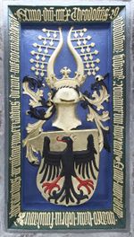 Der Stein war vergoldet und ursprünglich in der Außenmauer am Töpfertor angebracht, bis es um das Jahr 1833 abgebrochen wurde. In lateinischer Umschrift war zu lesen: „Im Jahre des Herrn 410 gründete Theodosius II., ein edler Spanier und römischer Kaiser, im vierten Jahre seiner Regierung diese Stadt und belehnte sie mit Freiheiten und kaiserlichem Wappen.“