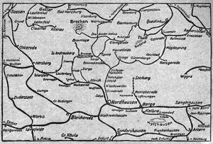 Vorwort[Bearbeiten | Quelltext bearbeiten]Zwei Gründe vornehmlich haben den Verfasser und Verleger veranlaßt, mit einem neuen Führer für Nordhausen und Umgebung hervorzutreten: 1) Der nach dem Kriege nunmehr wieder langsam erwachenden Freude am Wandern weiterhin Anregung zu geben, am Wandern, das wie nichts anderes jung und alt kräftig, lebensfroh und gesund erhält; 2) die Liebe zur heimatlichen Scholle zu festigen und zu stärken durch die Vermittlung der Erkenntnis, daß im kleinen, beschränkten Kreise der Heimat doch die Geschichte der ganzen Menschheit lebendig ist und daß in den Wundern der engen heimatlichen Natur doch die Schönheit der ganzen weiten, großen Gottesnatur gesehen und begriffen werden kann. Mit Rücksicht auf diese Ziele durfte das Büchlein keine Wegbeschreibung bis ins einzelne enthalten, sondern es soll nur eine Anregung zur Auswahl der Wanderungen geben. Zugleich ist dem Verfasser wohl bewußt, daß jede gute Karte besser als die eingehendste Auseinandersetzung orientiert, und es war deshalb gerade sein Bestreben, auf das hinzuweisen, was aus einer Karte nicht ersehen werden kann. Wenn der Leser aber bei der Angabe der Wege eine gewisse ungleichmäßige Behandlung in der Ausführlichkeit bemerkt, so wird er das nicht als einen Mangel ansehen, sondern diese verschiedene Bearbeitung darin begründet finden, daß für den trefflich mit Wegweisern ausgezeichneten Harz nicht die sorgfältige Beschreibung nötig war wie für das Eichsfeld und die Hainleite, wo eine Bezeichnung der Wege durch Wegweiser nur selten vorgesehen ist. Gerade aber auf die Schönheiten auch dieser oft mit Unrecht vernachlässigten Gegenden aufmerksam zu machen, ist als eine weitere Aufgabe des Buches anzusehen. Dem ganzen Charakter des Führers entsprechend mußte fernerhin abgesehen werden von jeder Empfehlung alles dessen, was mehr zufällig als unbedingt mit dem Boden verwachsen erscheint. Der Wirtshäuser ist deshalb nicht gedacht, auf die Einrichtungen für den Fremdenverkehr und den Kurbetrieb ist nur beiläufig hingewiesen, die Erwähnung moderner Verkehrsmittel erscheint nur da, wo sie für die Wanderung unbedingt nötig ist Auch sonst ist allem Unwesentlichen am Bilde unserer Landschaft möglichst geringe Beachtung geschenkt; historische Daten, Zahlenangaben von Höhen über dem Meeresspiegel, Einwohnerzahlen und dergl. sollen unser Gedächtnis so wenig wie möglich belasten. Auch mit Ortsnamen ist deshalb möglichst sparsam umgegangen, und mancher Bergrücken, den wir ersteigen, und manches Waldtal, das wir durchwandern, ist ohne Namen geblieben. Ja, selbst kleine Richtungsveränderungen im Wege sind in diesem Führer nicht immer aufgenommen worden, da es schien, daß eine zu ausführliche Wegbeschreibung zu stark Wichtigeres in den Hintergrund treten lassen müßte. Zudem mußte, um den Preis des Buches möglichst billig zu gestalten, mit dem Worte gekargt werden. Bei gewissen Daten hat dem Verfasser die Literatur der Heimat gute Dienste geleistet; besonders sind für historische Fakta die verdienstvollen Schriften K. Meyers und H. Heines unentbehrlich. Im allgemeinen hat der Verfasser aber keinen anderen Rat zu Hülfe genommen als den seiner eigenen Augen. Jede der von ihm aufgeführten Touren ist von ihm nicht einmal, sondern mehrfach abgeschritten, allerdings zunächst nicht zu dem Zwecke, ein Büchlein darüber zu schreiben. Deshalb haben ihm bei Inangriffnahme des Werkes selten eigene Aufzeichnungen vorgelegen; das Gedächtnis aber mag zuweilen irren. Sollten sich durch diese Arbeitsweise gar Fehler eingeschlichen haben, so wird gebeten, dem Verfasser alsbald Mitteilung zu machen. — Ob aber in der ganzen Auffassung und Behandlung des Stoffes dieser Führer überhaupt etwas Neues und nur ihm Eigentümliches bringt, mag der geneigte Leser beurteilen. Zur Benutzung des Führers sei gesagt: Es wird in den ersten Wanderungen die nähere Umgebung Nordhausens behandelt. Bei den Ausflügen in den Harz bedingt, wenigstens für Nordhausen, das Ilfelder Tal einen so bedeutsamen Einschnitt, daß es tunlich schien, zunächst den Südharz westlich und dann östlich dieses Tales abzuwandern. Eichsfeld, Hainleite, Kyffhäuser schließen sich an. Die Touren sind nur so weit aufgezeichnet, als man Nordhausen noch als besten Ausgangspunkt für die Wanderungen bezeichnen kann. Deshalb ist auch nur eine zweitägige Wanderung (Sachsenburg) aufgenommen. Im übrigen findet man im Inhaltsverzeichnisse die Stichwörter.— Bei Bezeichnung der Wegrichtungen sind möglichst die Himmelsrichtungen herangezogen worden; wo aber mit „rechts“ und „links“ gearbeitet wird, bedeutet die Anweisung stets die Seite, die sich von der bisher verfolgten Marschrichtung aus ergibt. — Die Länge des Weges nach Kilometern anzugeben, war bei den vielfach verschlungenen, selten mit Maßsteinen ausgezeichneten Pfaden ein Ding der Unmöglichkeit. Es ist deshalb die Marschdauer in Stunden angegeben. (1 km = etwa 12 Minuten.) Dabei ist aber zu berücksichtigen, daß für Ruhepausen und Besichtigungen keine Zeit eingesetzt ist. Die jedesmal angegebene Zahl schließt allein die Marschstunden ein.